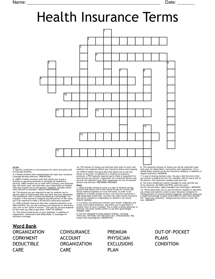 Health Insurance Terms Crossword WordMint