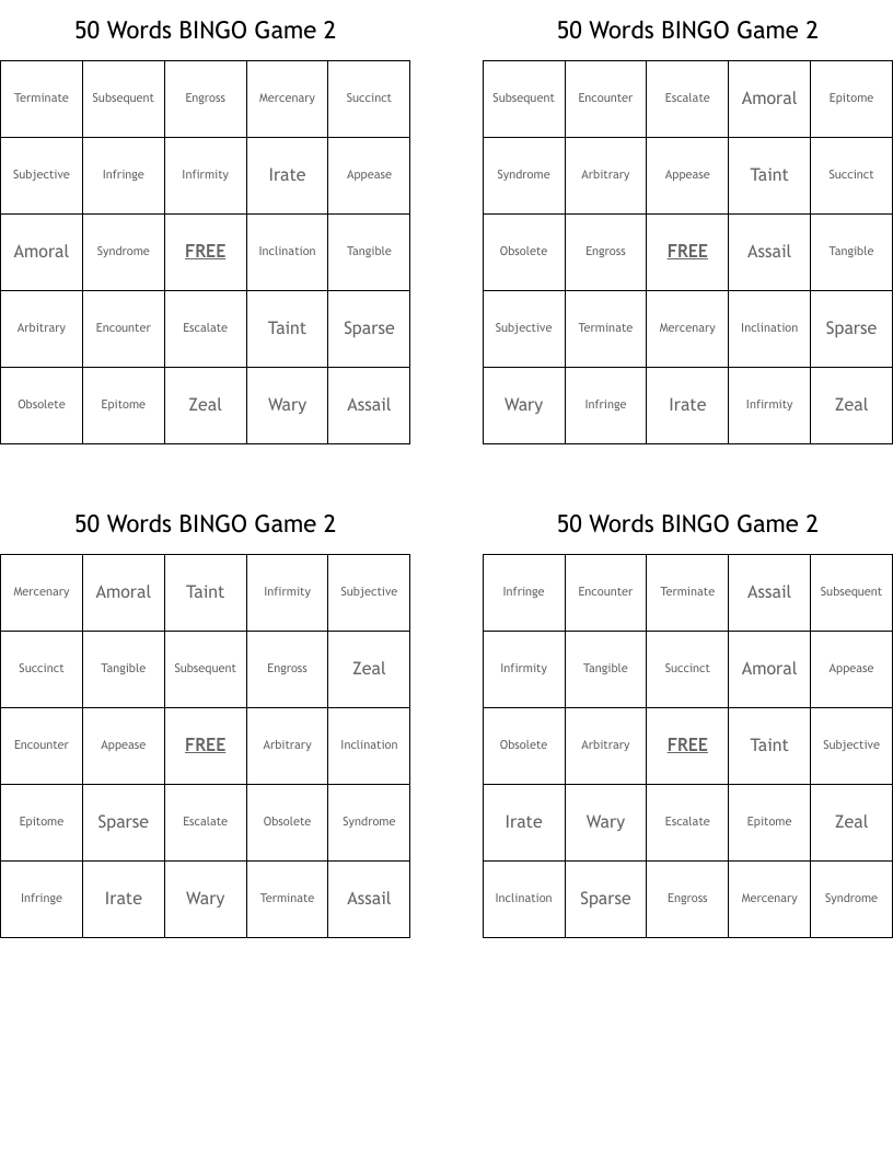 50 Words BINGO Game 2 WordMint