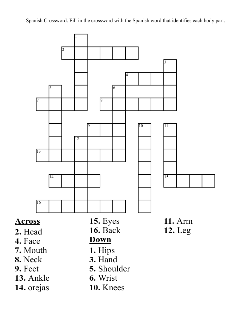 Spanish Crossword Fill In The Crossword With The Spanish Word That Identifies Each Body Part WordMint